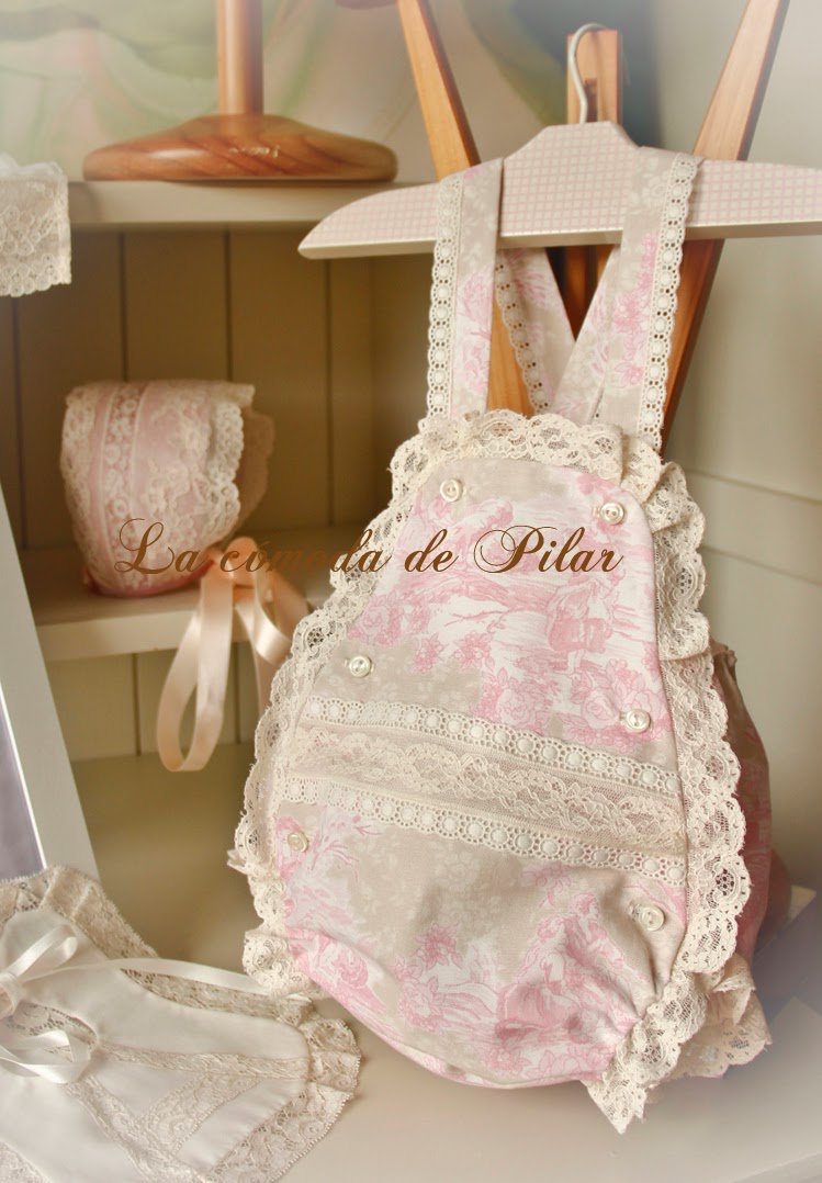 Conjunto de ranita con peto en canulón con estampación victoriana en rosa y beige, remates con encjaes de alençon y bodoque bordado, forro en batista de organza beige.